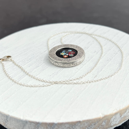Hand Stamped Sterling Silver Frame Necklace with Floral Enamel Centerpiece