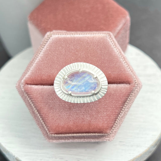 Sterling Silver Rainbow Moonstone Ring with Radiating Lines