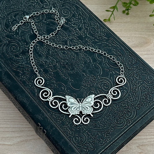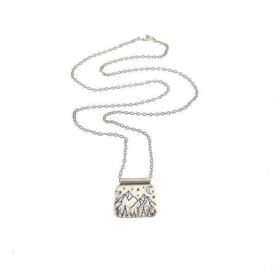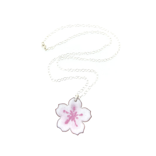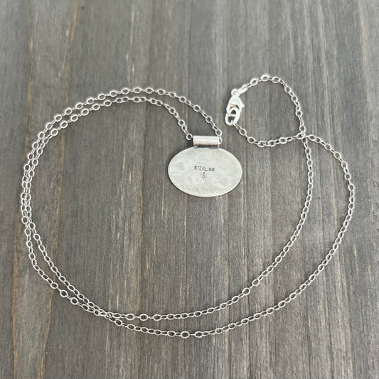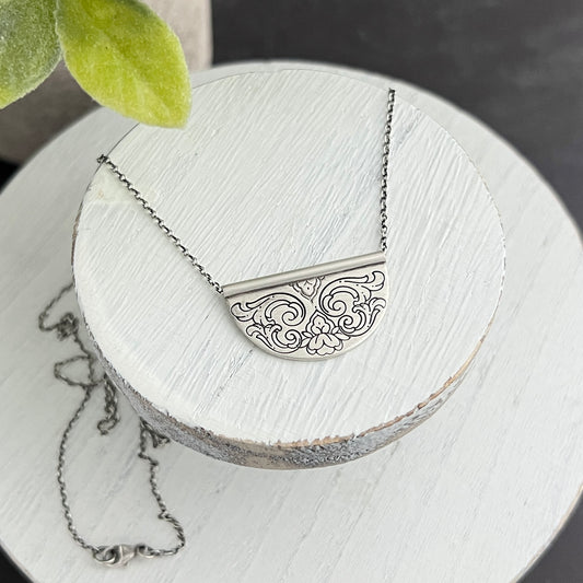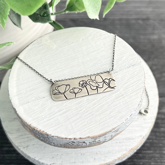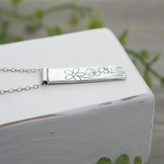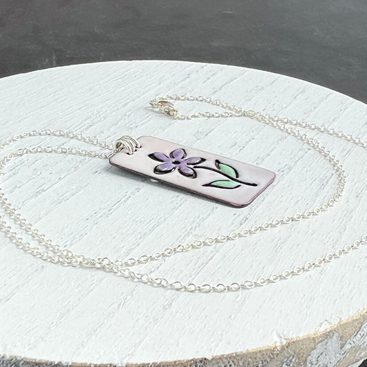 Hand Stamped Sterling Silver Frame Necklace with Floral Enamel Centerpiece