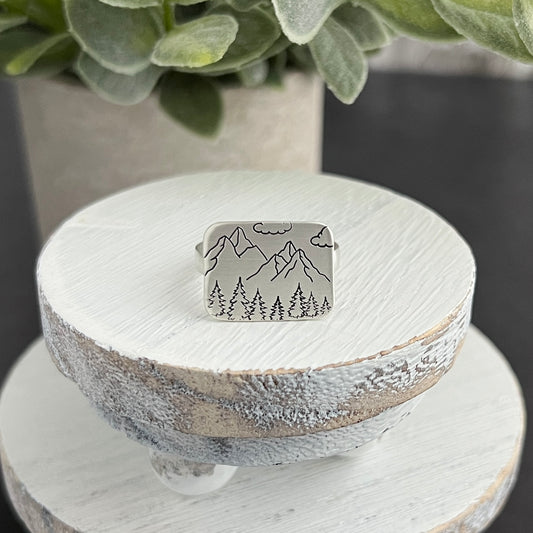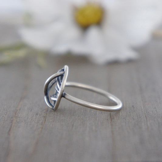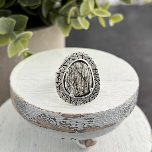 Sterling Silver Black Tourmalinated Quartz Ring with Abstract Stamped Frame
