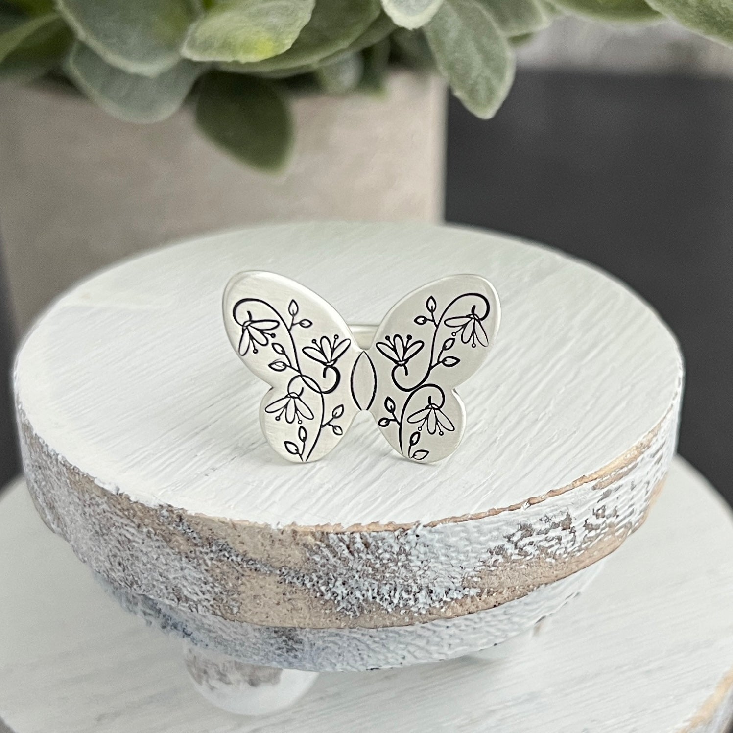 This sterling silver ring boasts a hand-stamped floral vine scene on its butterfly shaped bent top. With every glance, you'll be reminded of the majestic beauty of nature. Perfect for those who love a whimsical look.