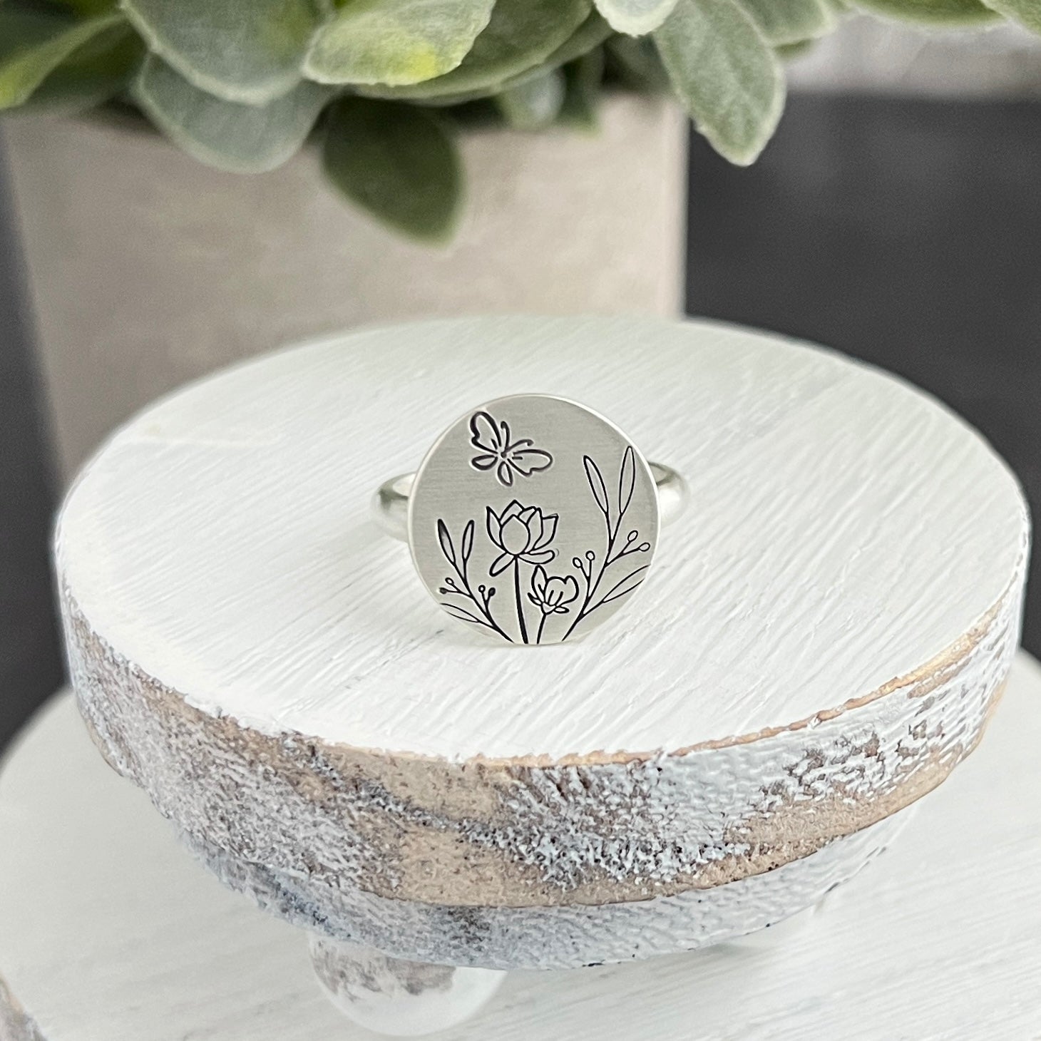 This sterling silver ring boasts a hand-stamped flower scene with a butterfly on its flat round top. With every glance, you'll be reminded of the majestic beauty of nature. Perfect for those who love flowers and the outdoors, this ring is a tangible expression of your love for beauty in nature.