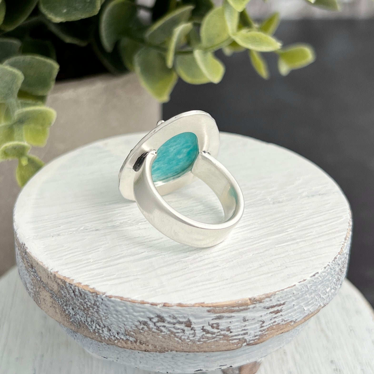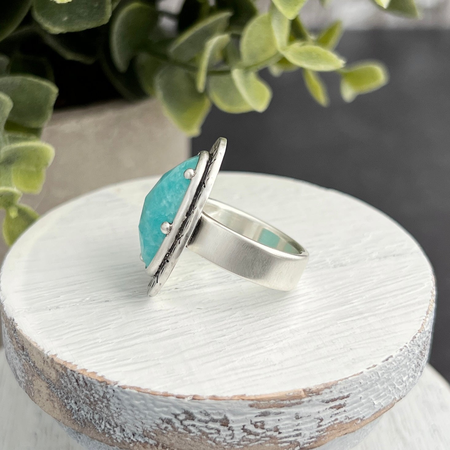 This sterling silver ring features a striking large freeform rose-cut amazonite stone, uniquely shaped to highlight its natural beauty. The hand-fabricated mounting is adorned with a detailed hand-stamped design on the frame, adding artisanal charm and elegance. Perfect for making a statement, this ring combines exceptional craftsmanship with the soothing allure of amazonite