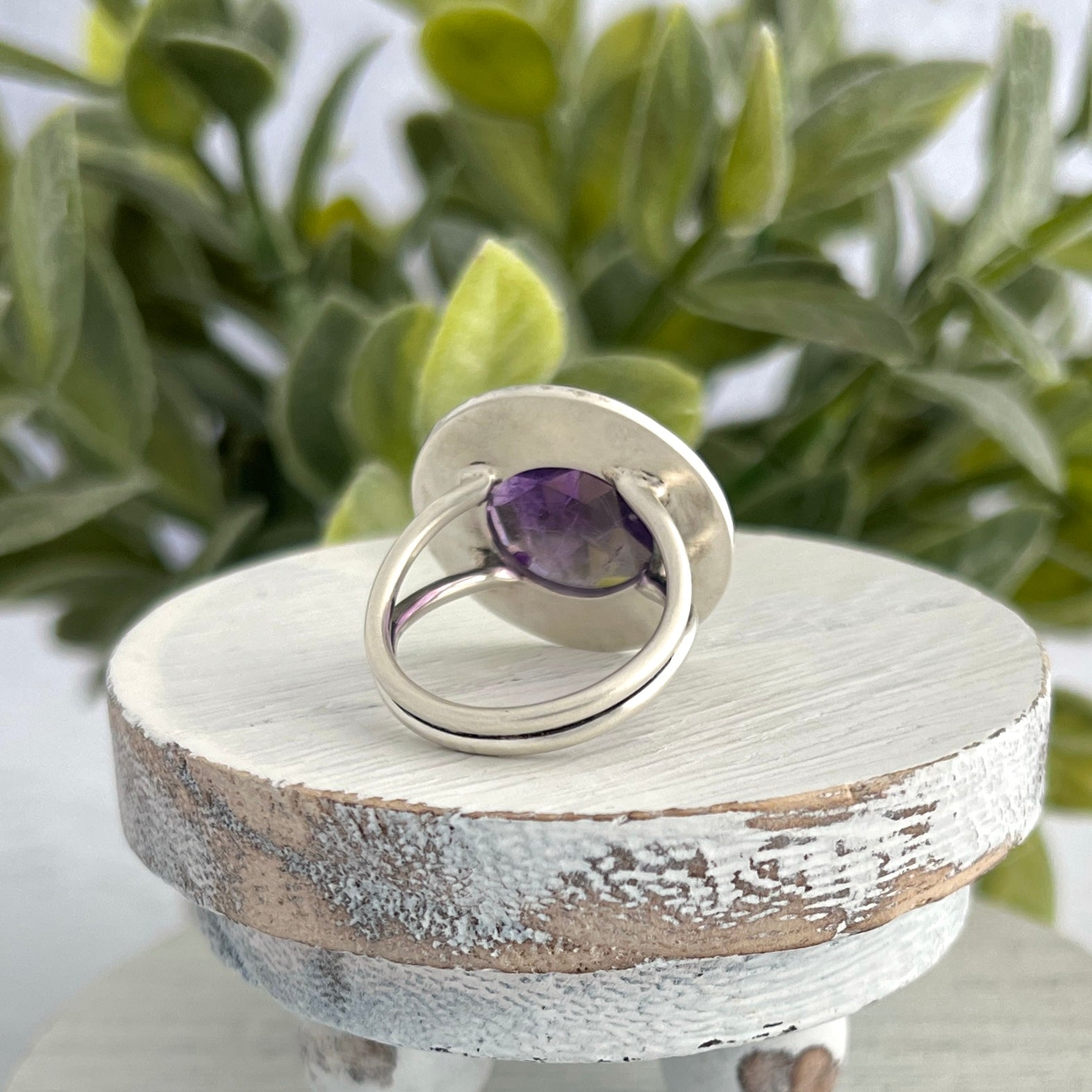 Elevate your style with this sterling silver ring, showcasing a round rose-cut amethyst. The gem is beautifully surrounded by a line-stamped backplate frame, highlighting its beautiful color and triangular facets. Set atop a split round wire band, this ring offers both comfort and elegance, making it a captivating piece for any occasion.