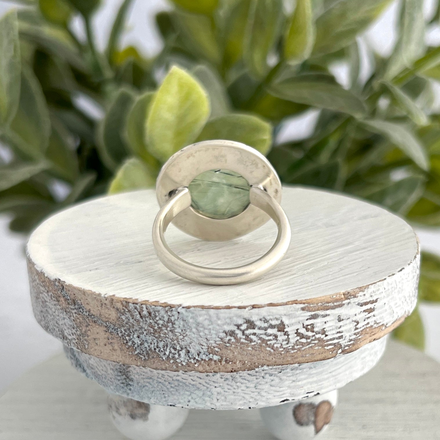 This sterling silver ring features a striking round rose-cut prehenite stone with dark green needle-like inclusions. Its hand-fabricated mounting is adorned with a detailed hand-stamped abstract line design on the frame, adding artisanal charm and elegance. Perfect for making a statement, this ring combines exceptional craftsmanship with an edgy look that is sure to captivate.