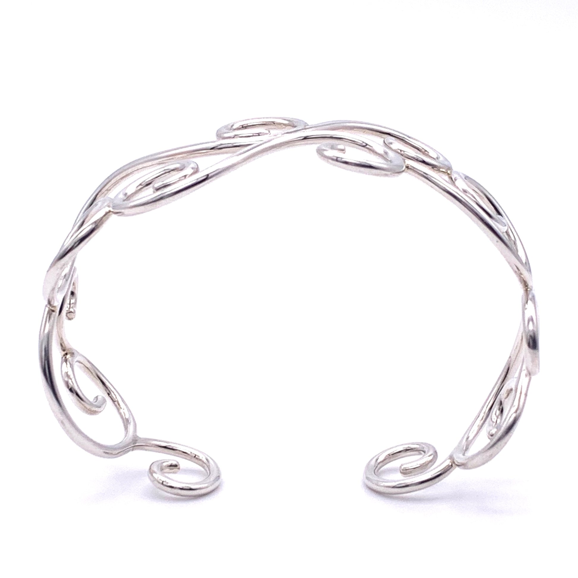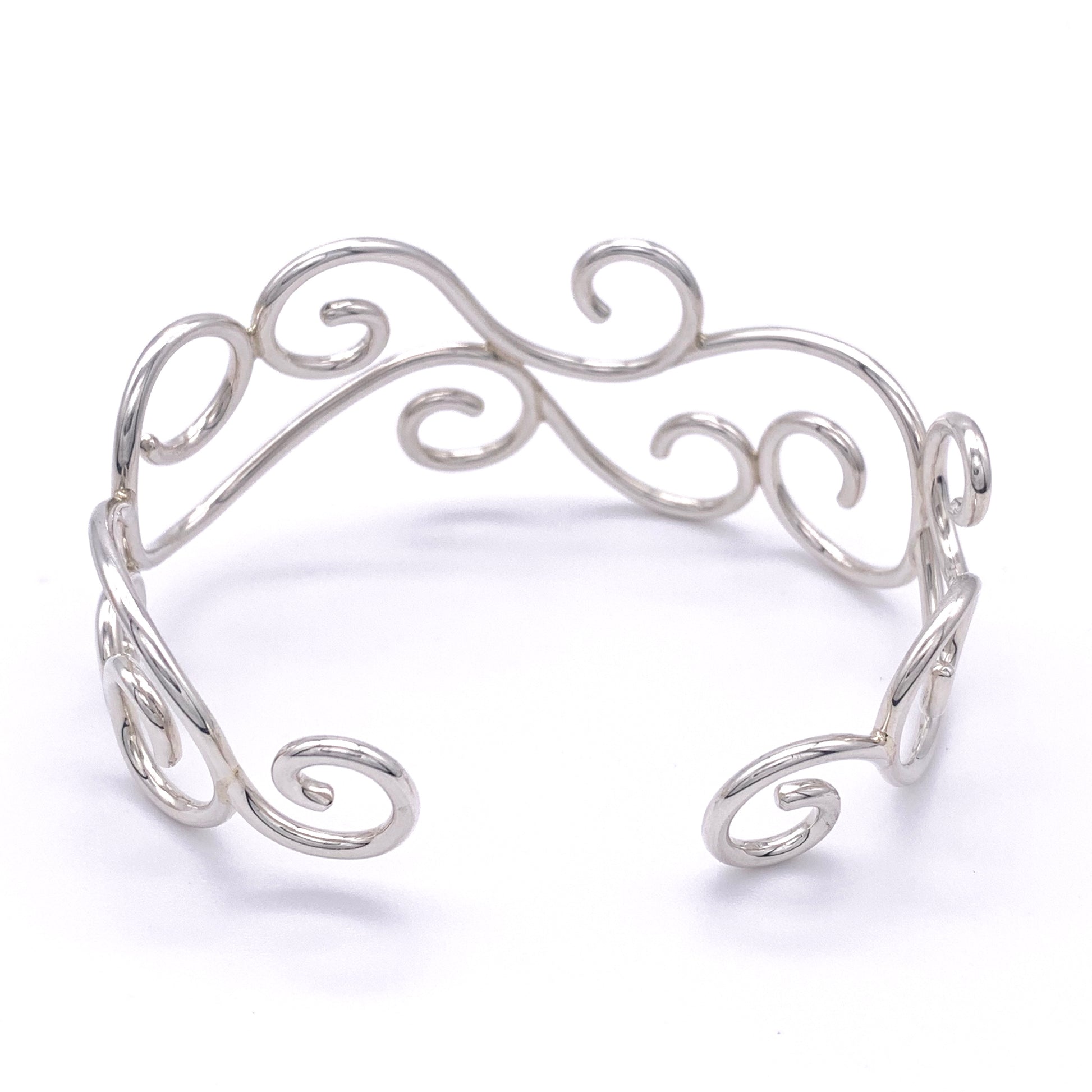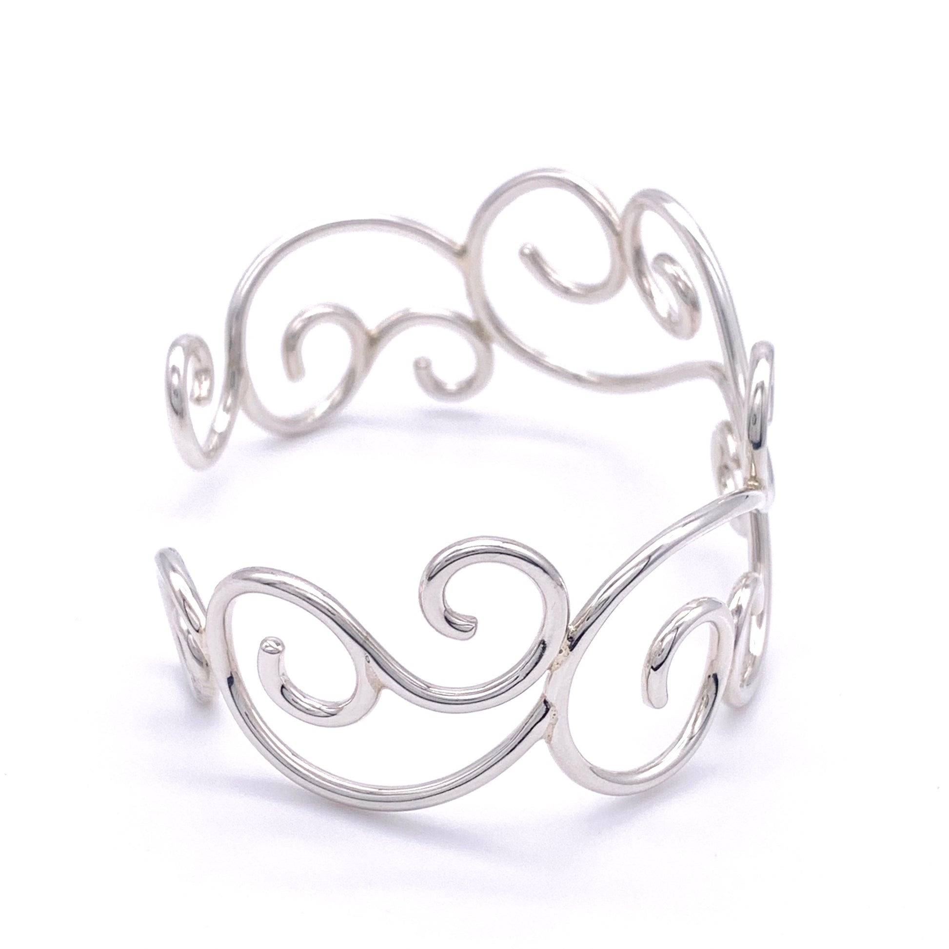 Discover the stunning Sterling Silver Swirl Cuff! Handmade with expert craftsmanship, this beautiful bracelet exudes elegance and timeless style. From its gorgeous sterling silver swirls to its comfortable round-wire form, this piece is sure to become your favorite go-to accessory. Invest in a classic look that won't go out of style!